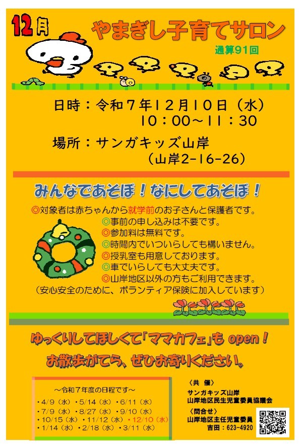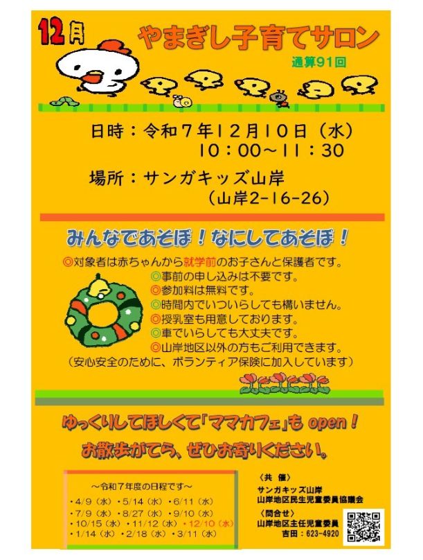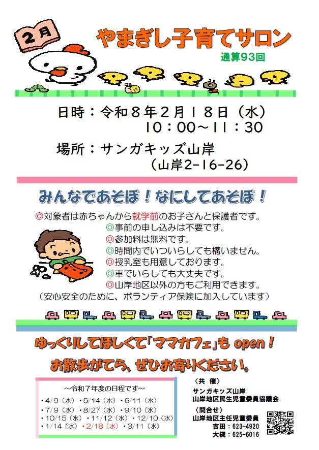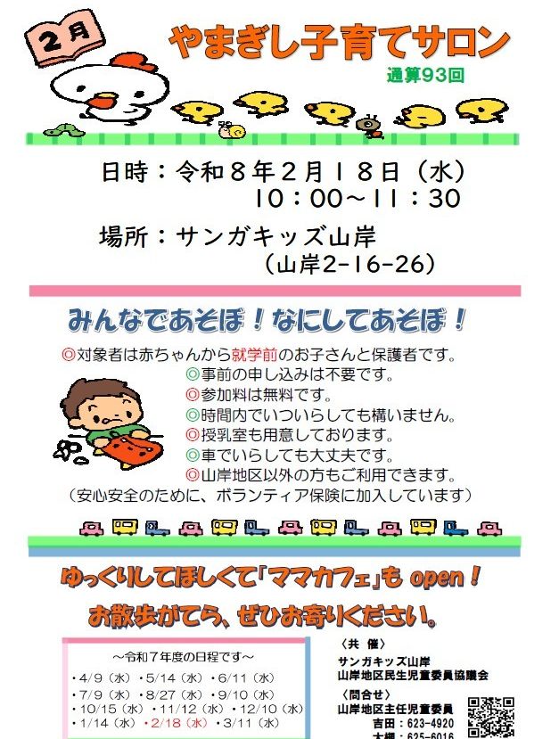HOME | 子育てサロン子ども食堂フリスペ <やまぎし子育てサロン> <こども食堂> ☆令和6年7月6日(土)12時~(決定) 8月は夏休み中の為、子ども食堂お休みです。 ☆令和6年9月7日(土)12時~ (予定) 子ども食堂を予定しています。 場所:サンガキッズ山岸・サンガキッズ津志田 テイクアウトあります! コロナ感染症の状況によっては 直前でも中止する場合があります。 その場合は学童玄関に中止の掲示をします。 ご不明な点はお問い合わせください。 <中学生のフリースペース FSサンガ 開設しました> 令和6年度は平日10時~12時半まで フリースペースを行っています。 担当:柏舘 問合せ:019-658-9701