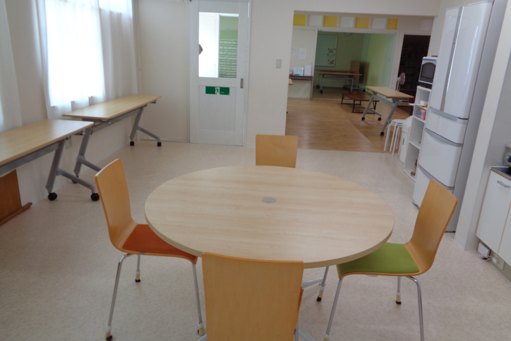 フリースペースにはキッチンがあります。手作りおやつをしたり、配膳をする場所にしています。調理をしていないときは丸テーブルで塗り絵をしたり折り紙をして子ども達は遊んでいます。