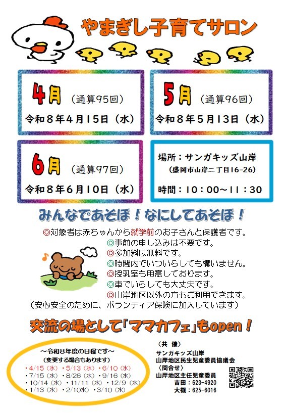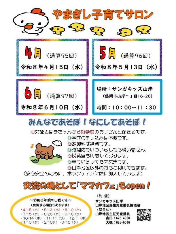 HOME | 子育てサロン子ども食堂フリスペ <やまぎし子育てサロン> <こども食堂> ☆令和8年2月21日(土)12時~ ☆令和8年3月14日(土)12時~ 子ども食堂を予定しています。 場所:サンガキッズ山岸・サンガキッズ津志田 テイクアウトあります! ご不明な点はお問い合わせください。 <中学生のフリースペース FSサンガ 開設しました> 平日10時~12時半まで フリースペースを行っています。 担当:佐々木 問合せ:019-658-9701