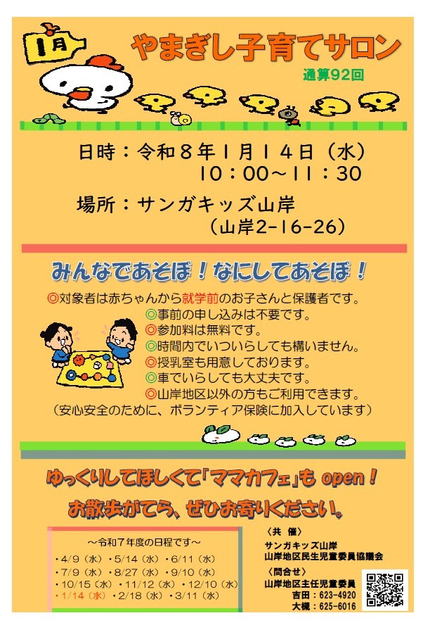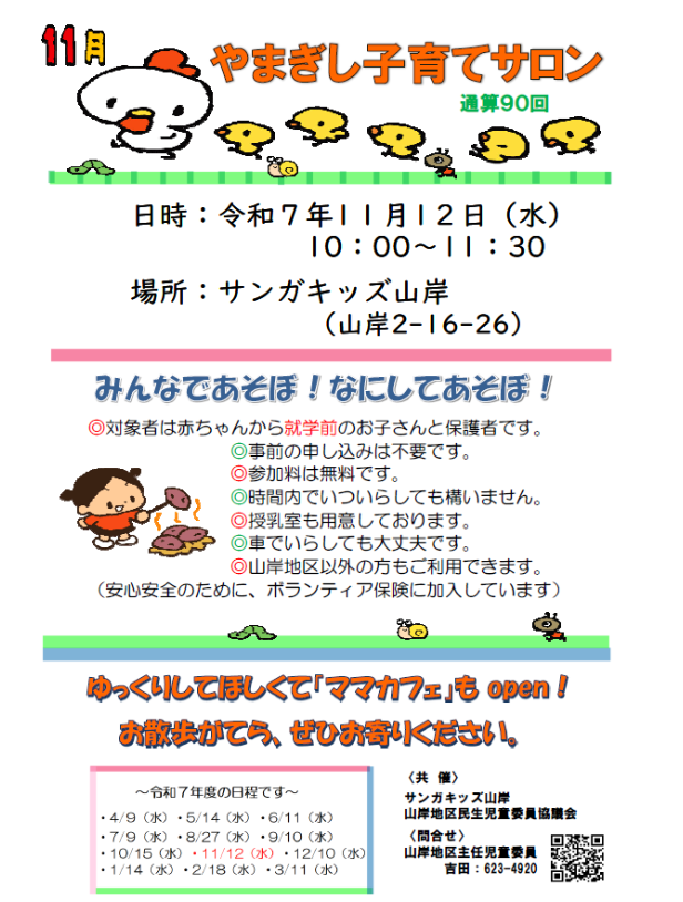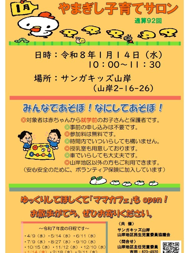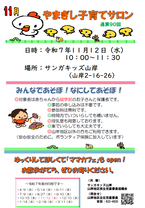 HOME | 子育てサロン子ども食堂フリスペ <やまぎし子育てサロン> <こども食堂> ☆令和6年7月6日(土)12時~(決定) 8月は夏休み中の為、子ども食堂お休みです。 ☆令和6年9月7日(土)12時~ (予定) 子ども食堂を予定しています。 場所:サンガキッズ山岸・サンガキッズ津志田 テイクアウトあります! コロナ感染症の状況によっては 直前でも中止する場合があります。 その場合は学童玄関に中止の掲示をします。 ご不明な点はお問い合わせください。 <中学生のフリースペース FSサンガ 開設しました> 令和6年度は平日10時~12時半まで フリースペースを行っています。 担当:柏舘 問合せ:019-658-9701